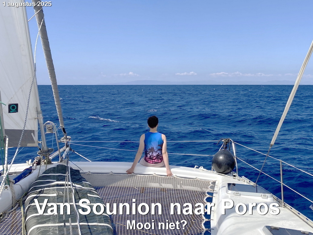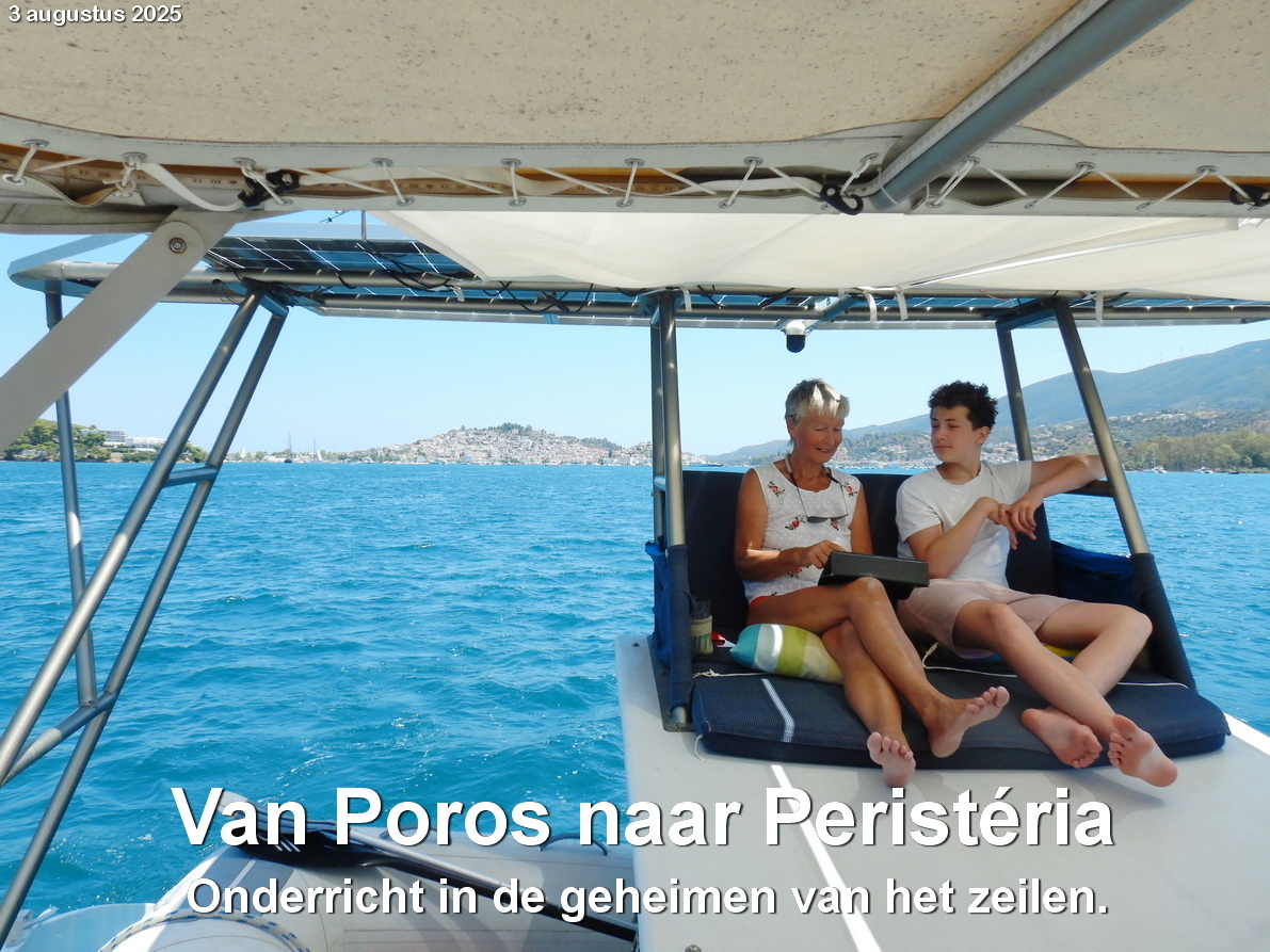 De hele maand augustus is het zonnig en warm weer. Met voldoende wind om te zeilen. Hoewel dat vaak in de middag is. De eerste week is kleinzoon Tiam er nog. Daarna is er soms teveel wind, waardoor we een week in de buurt van Poros blijven. We zijn al een beetje op de terugweg. Bezoeken wat plaatsen van de Peleponnesos en een eiland, waar we niet eerder geweest zijn. Aan het einde van de maand treffen we dit seizoen de eerste mensen, die we kennen van Licata.