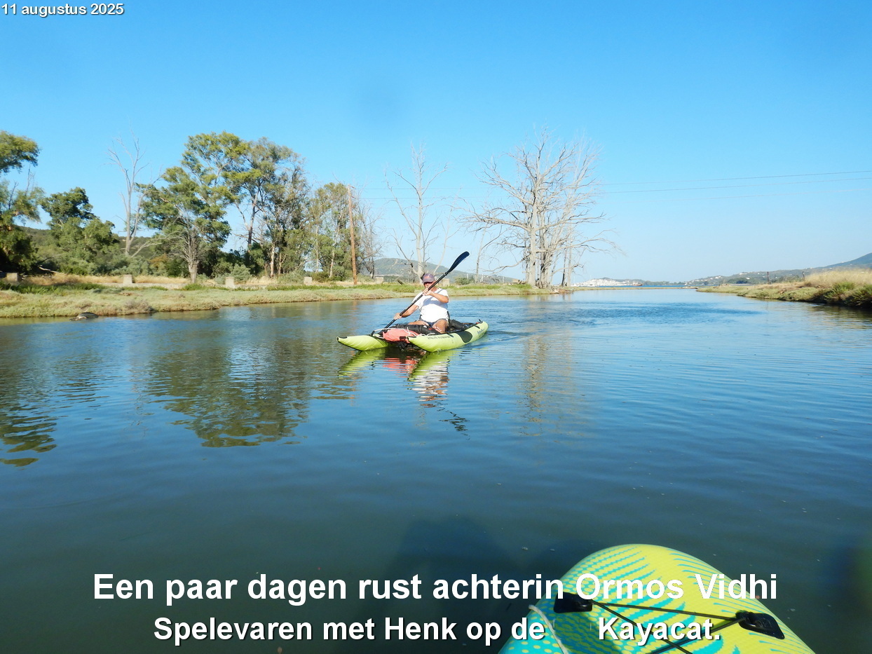 Eind van de middag pompen we de Kayacat op. We gaan een verkenningsrondje doen. Henk peddelt op de Kayacat, ik op de sup.