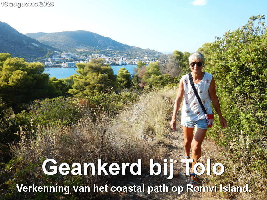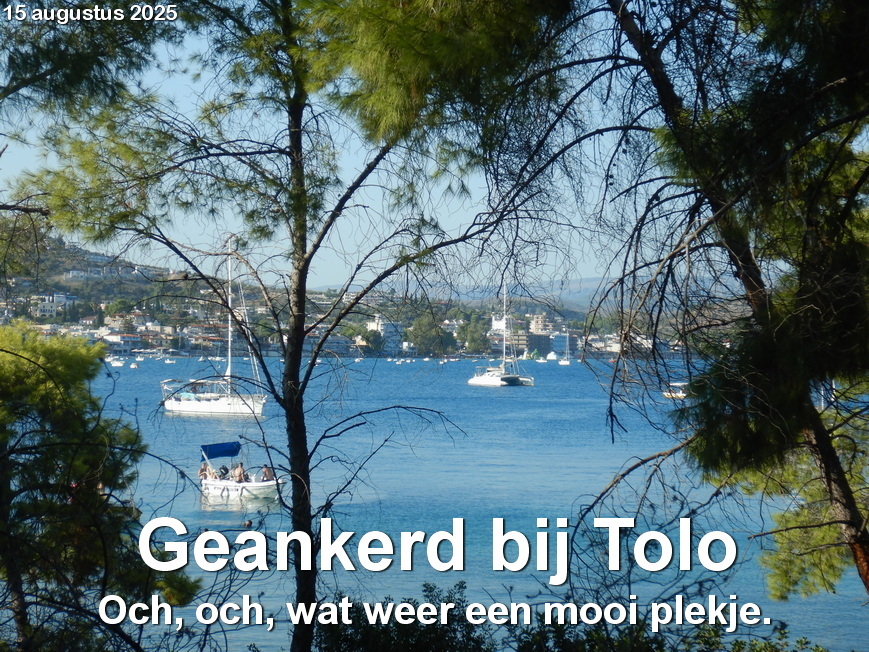 Bij Ermioni zeilen we nog lekker, dus we gaan door tot Porto Cheli. Ten zuiden van Ermioni zien we rook van een bosbrand en even later een blushelikopter. Bij Porto Cheli in de buurt kijken we naar een ankerplek achter een eilandje. Er liggen al te veel boten. Het zeilt nog steeds lekker, dus verder maar. Uiteindelijk ankeren we na 49 mijlen tussen Tolo en het eiland Romvi.