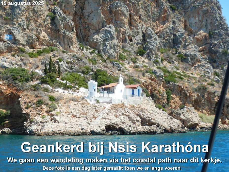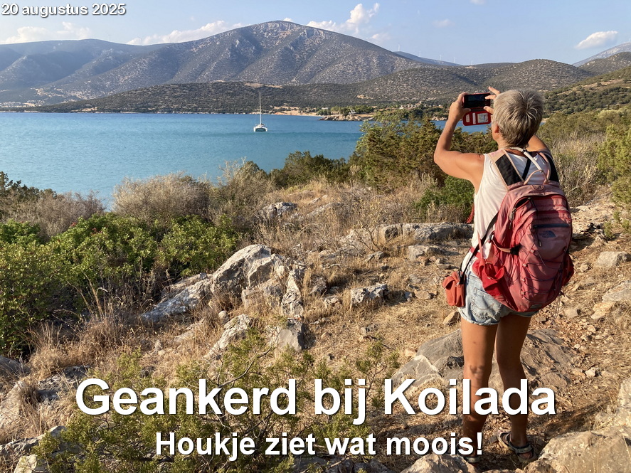We wachten op wind uit het zuidoosten. Die komt elke middag, zo tussen 12 en 1 uur. Vandaag zeilen we aan de wind naar de overkant, naar Koilada. Een mooie snelle tocht. 18 mijlen in 2,5 uur.