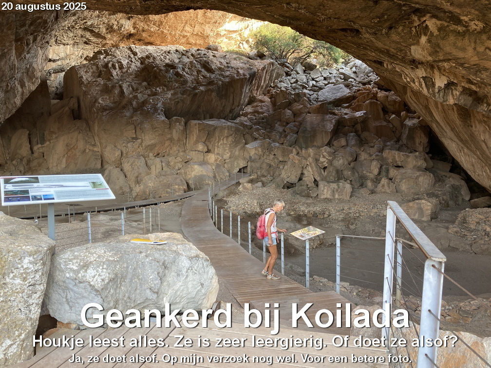 Net om de hoek van onze baai naar het zuiden is een grote grot. Die gaan we bezoeken. De bijboot kunnen we afmeren aan een steiger. Vandaar loopt een pad omhoog naar de grot. Er zijn diverse borden met uitleg in het Grieks en het Engels.