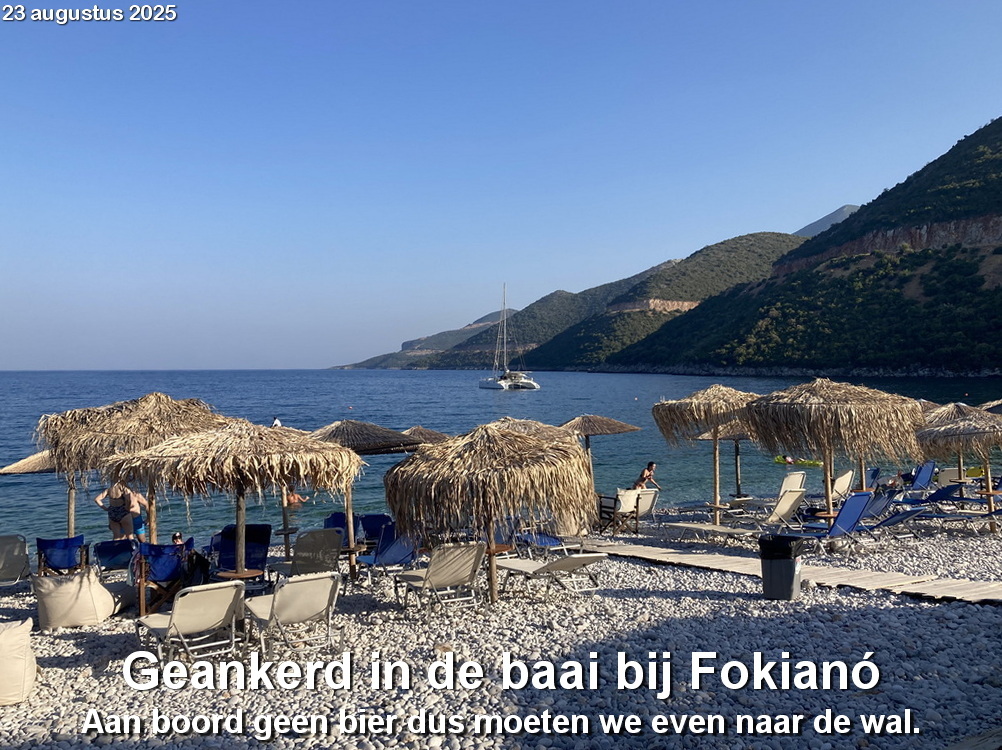 We ankeren bij Fokianó op 200 meter van het strand. Waterdiepte is 15 meter.