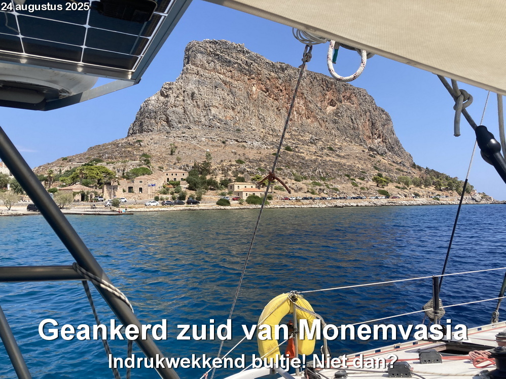 Na 6,5 uur valt het anker in een zandspot. Aan de zuidkant van Monemvasia. Hij zit goed vast. Dat zien we later bij het snorkelen. Er zijn ook heel veel vissen en visjes. Allerlei soorten en maten. Mooi!