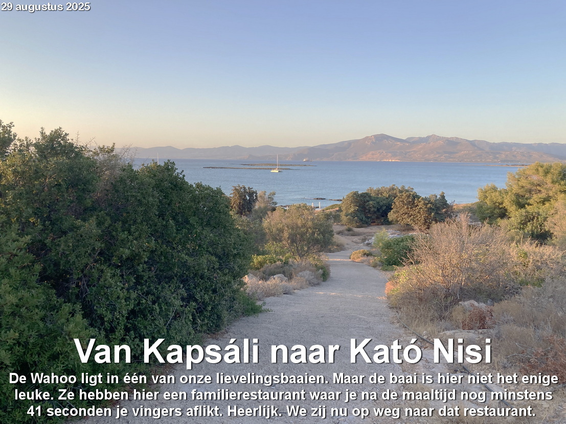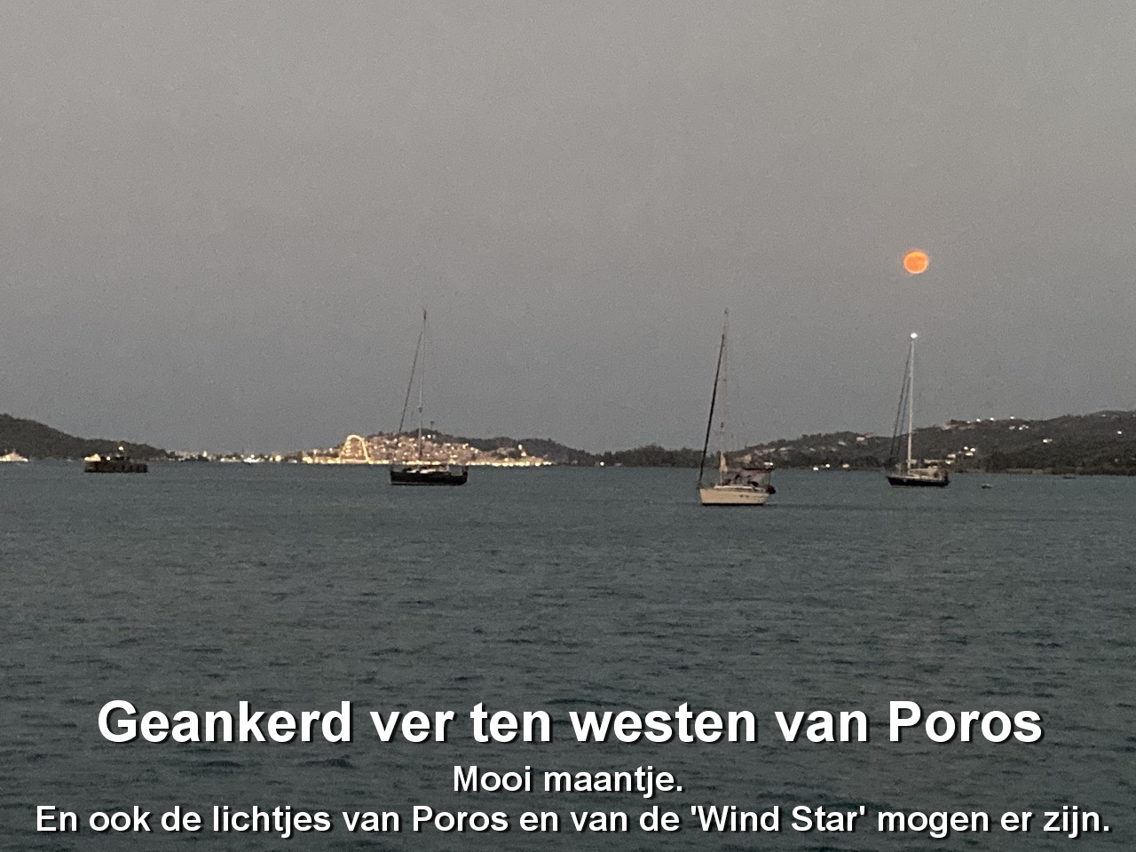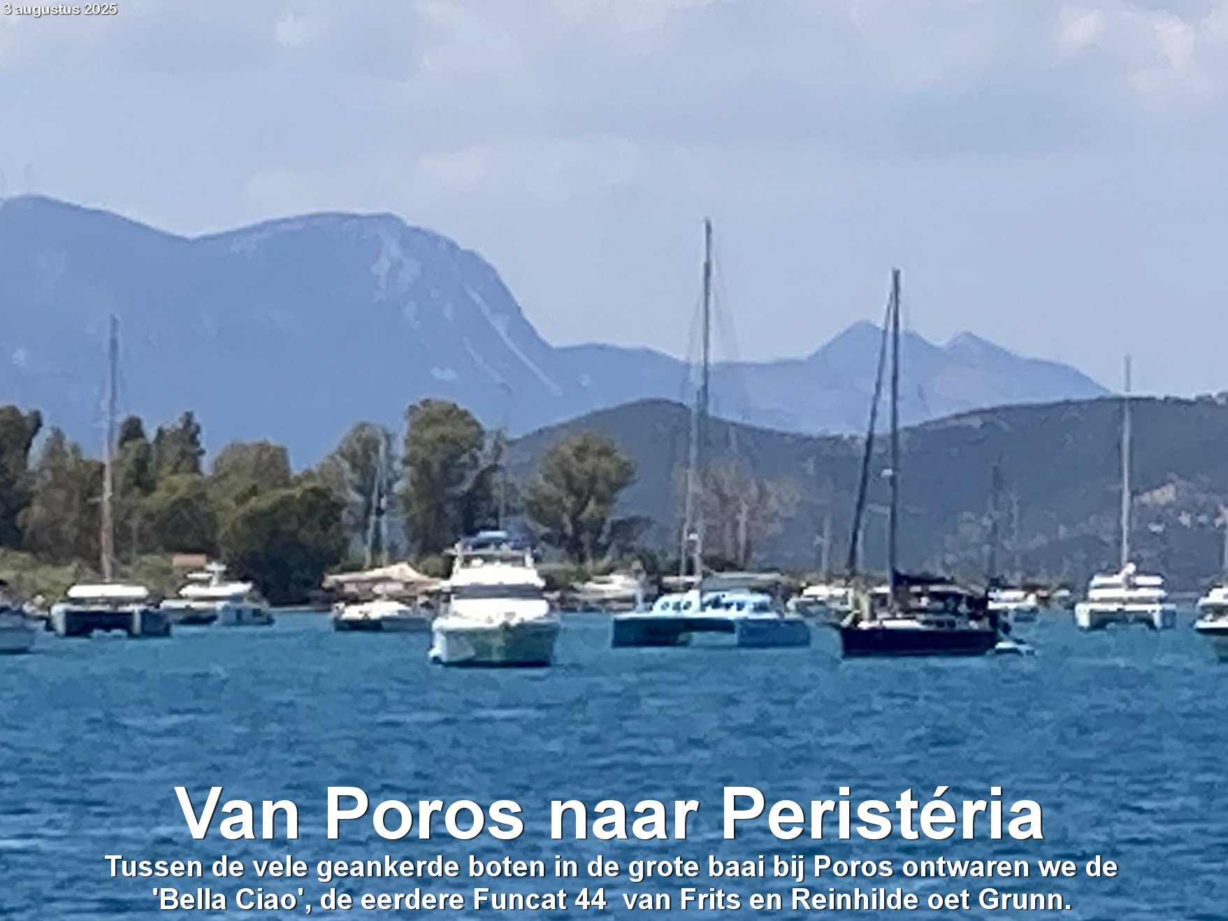 Tot een uur of 1 is het heel rustig en warm weer. Als het een poosje waait uit het zuidoosten vertrekken we. Eerst langs de zuidkant van Poros. Het is mooi daar vanaf het water. Tussen veel geankerde boten zien we de blauwe catamaran ‘Bella Ciao’, die van Frits en Reinhilde geweest is.