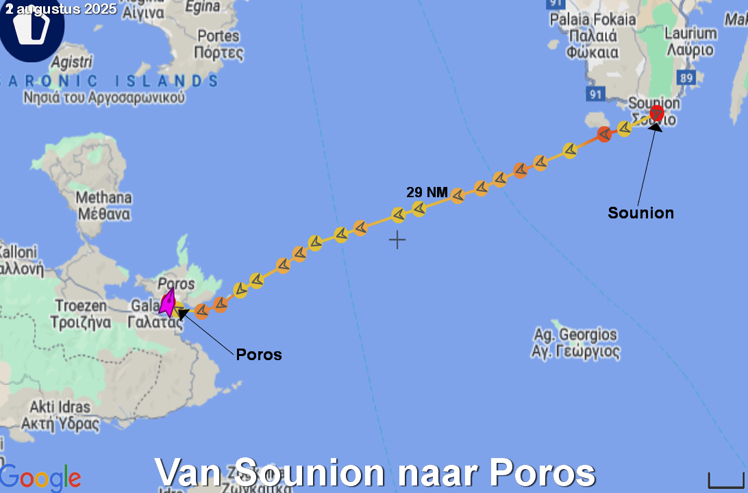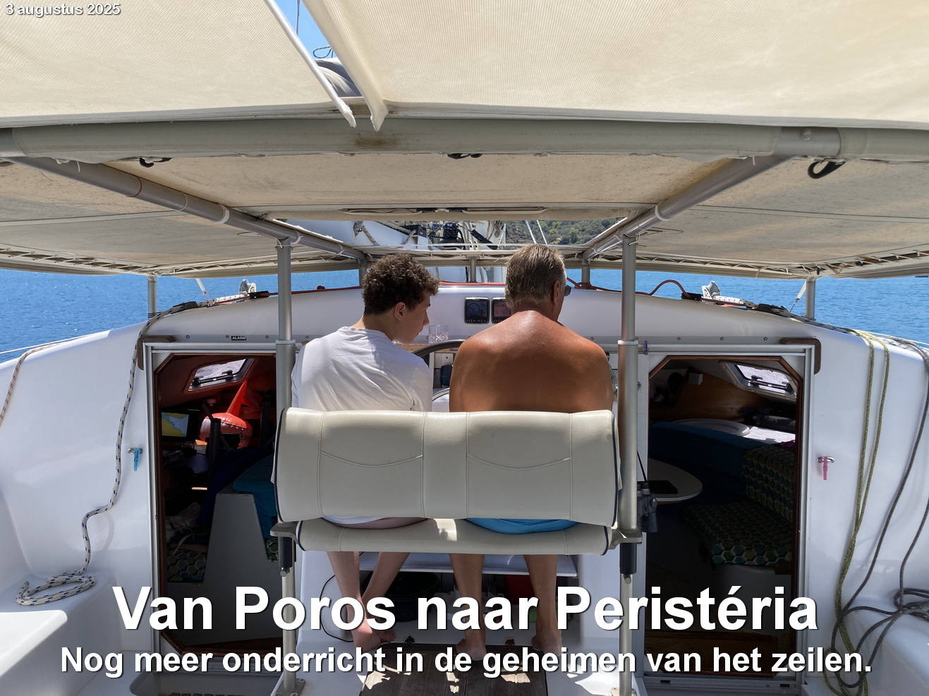 Daarna vallen we wat af richting Poros. Zodat de windhoek groter wordt.
