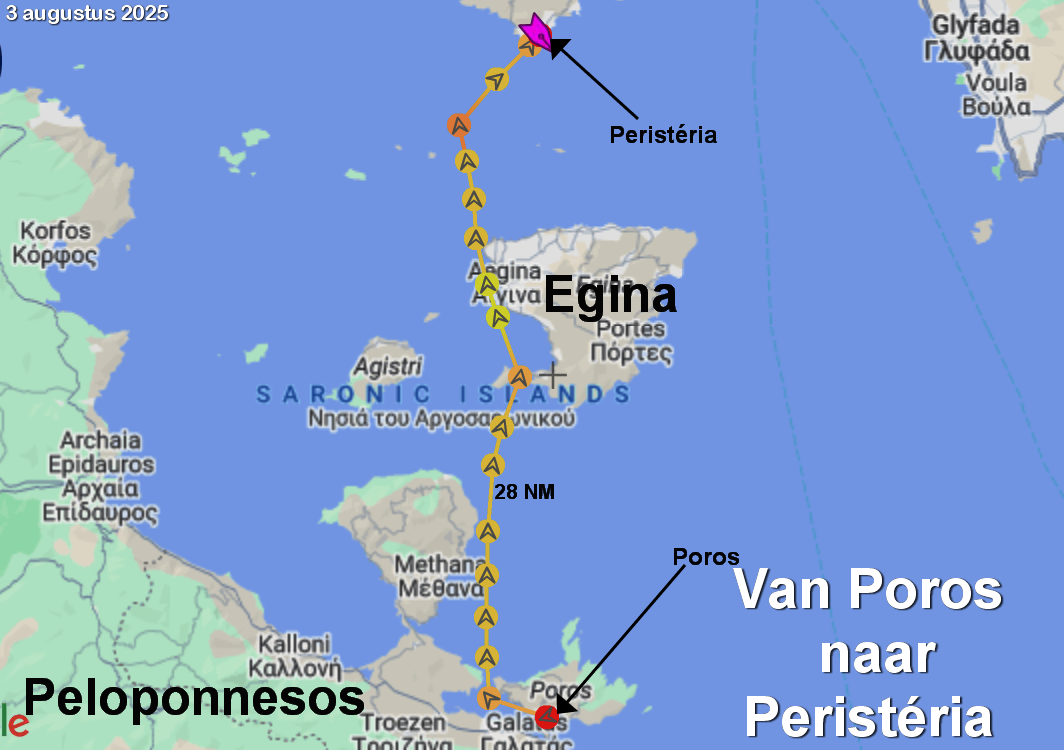 Ons doel is de eilandjes bij Peristéria, waar we al 2 keer eerder geweest zijn. Het is goed bezeild. Later aan de westkant van Egina kan de fok erbij over stuurboord. Omdat het recht voor de wind is.
