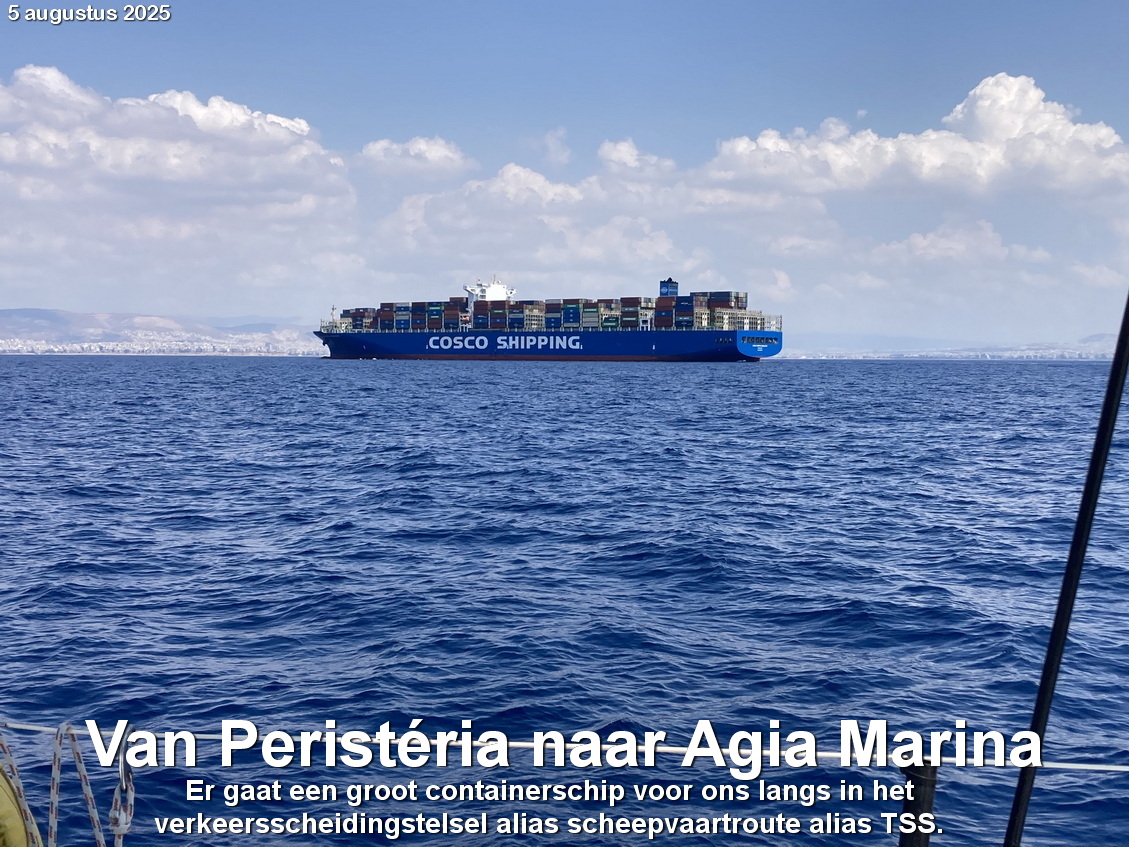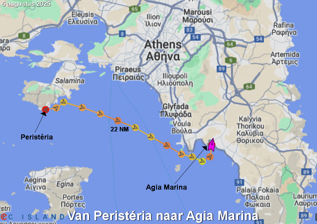 Wat een mooie zeildag! Met grootzeil bakboord en genua over stuurboord zeilen we eerst voor de wind langs de kust van het eiland Salamina in oostelijke richting. Daarna wijzigen we de koers naar het zuidoosten. Om net noord van het verkeersscheidingsstelsel uit te komen.