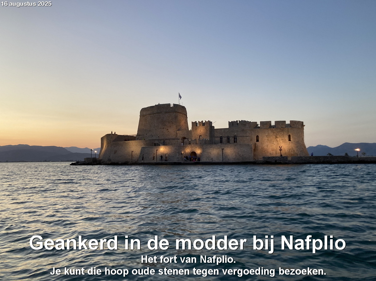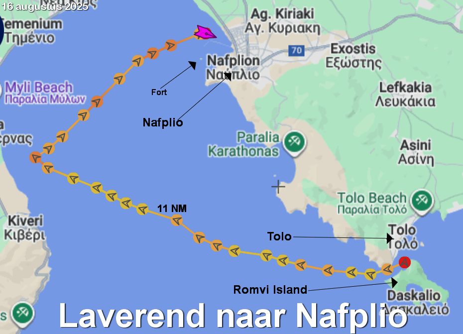 Het waait de hele ochtend behoorlijk. We willen naar Nafplio. Dat is naar het noorden. De wind is ook noordelijk. De afstand is 6,5 mijl. We zijn te lui om het grootzeil te hijsen. Met alleen de fok lukt het om een heel eind naar het noordwesten te komen. Maar als we overstag gaan is de hoek erg slecht. Motoren aan en fok inrollen. De laatste 2,5 mijl doen we motorend. We ankeren in ondiep water van 3,5 meter. Ten noordoosten van de havenpier. Daar liggen we ook beschut als de wind later naar het zuiden draait.