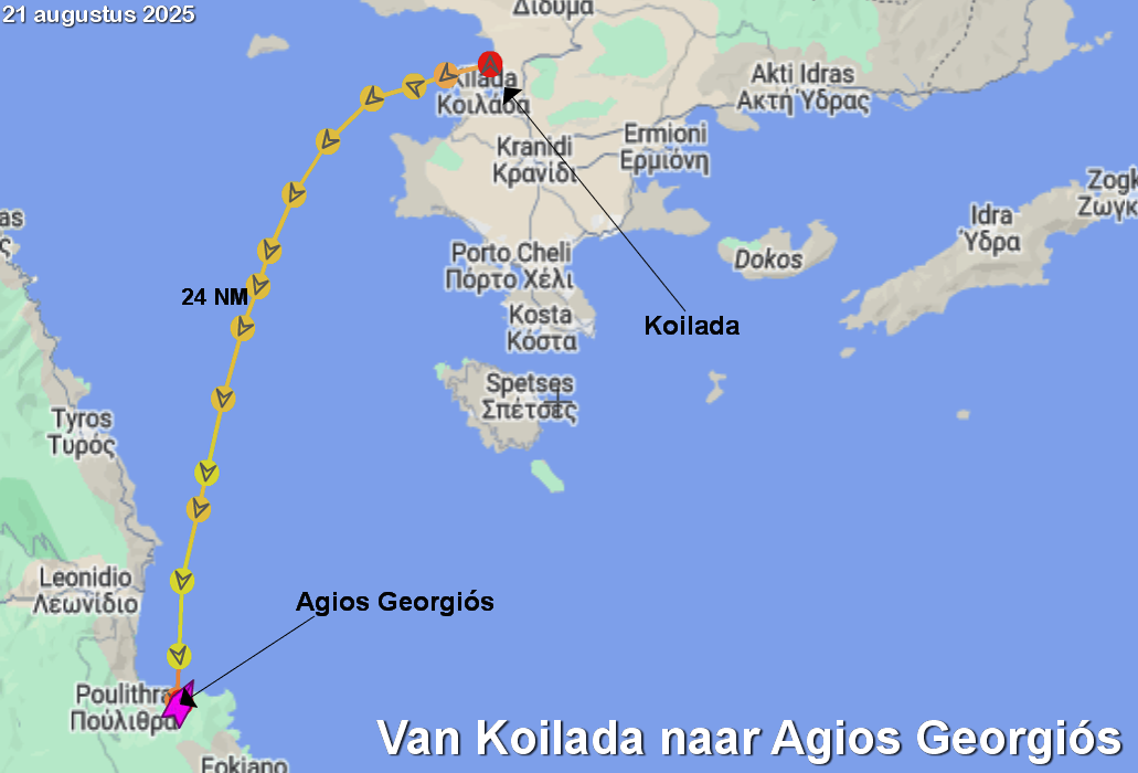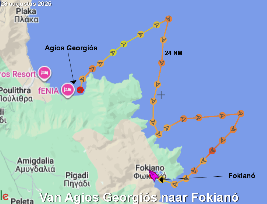 We vertrekken om 1 uur. De wind is dan westelijk. We hijsen het grootzeil en rollen de genua uit. Eerst is de wind nog tegen en kruisen we. Daarna wordt de wind steeds meer zuidelijk en later zuidoost. De baai bij Agios Georgiós is bezeild. Dat is ons doel.