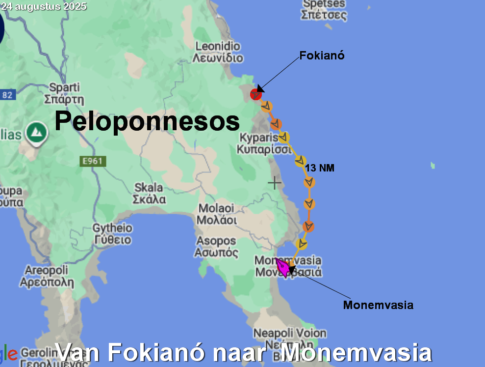 We willen naar Monemvasia, een afstand van 27 mijlen.