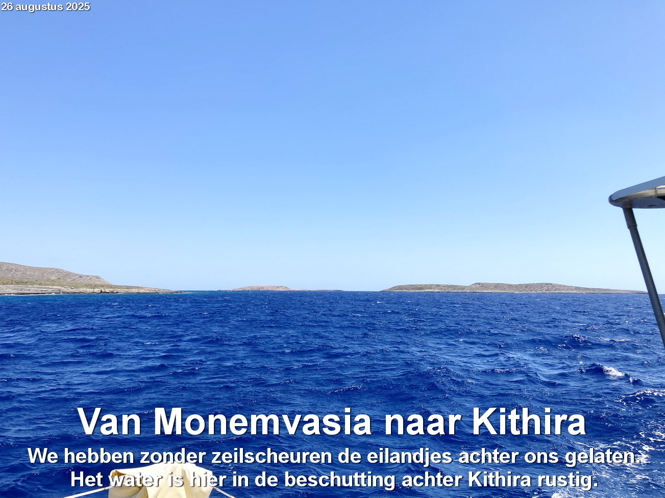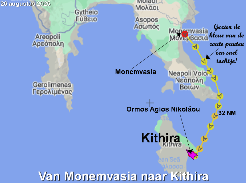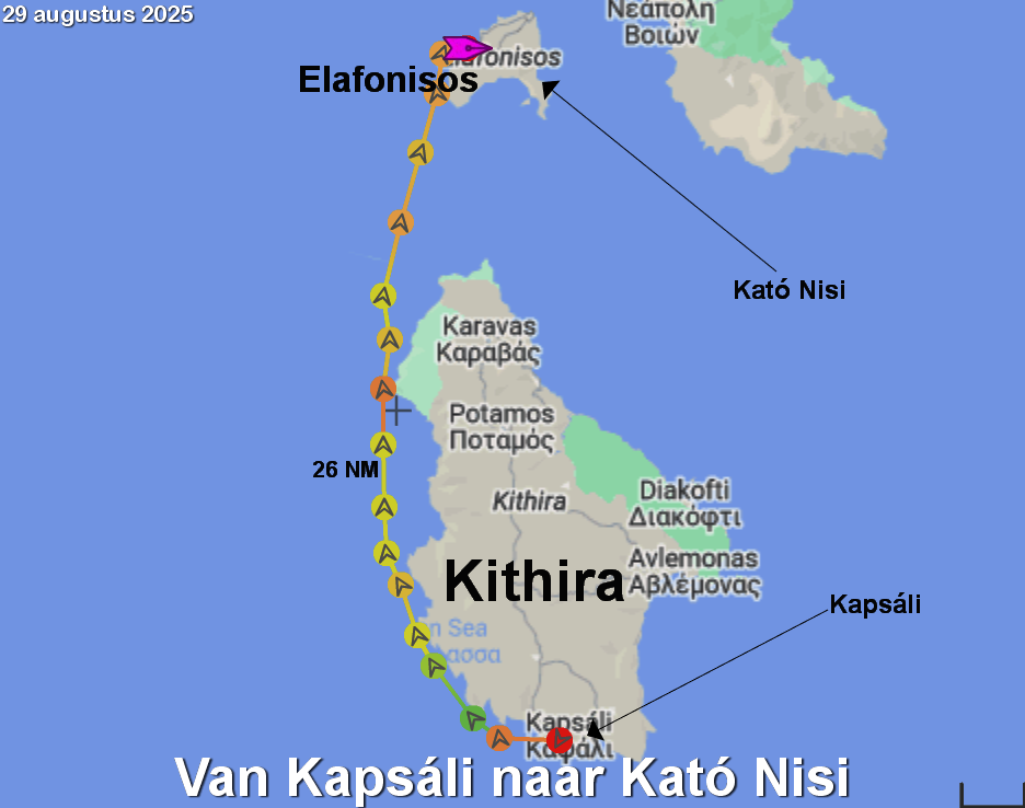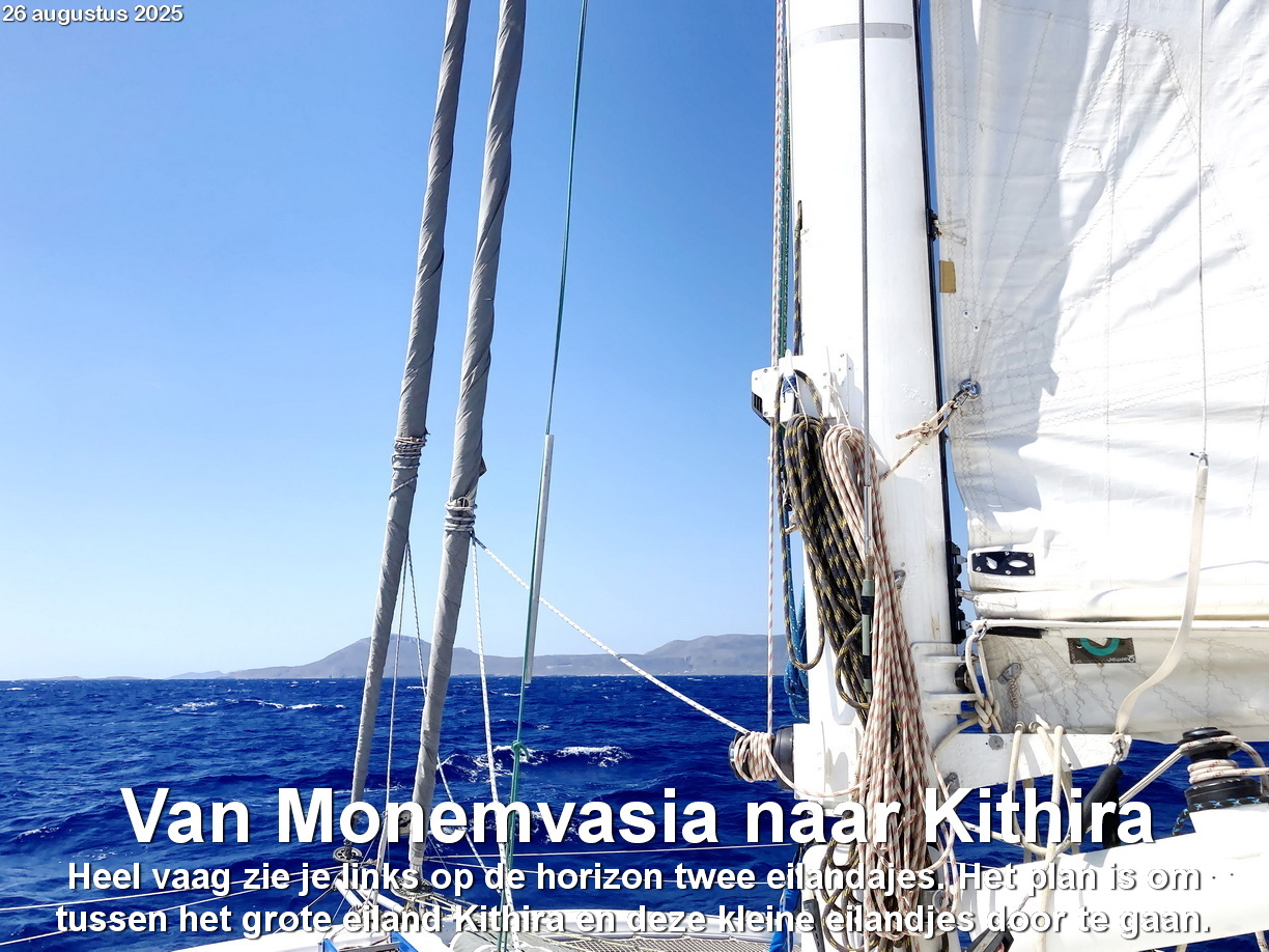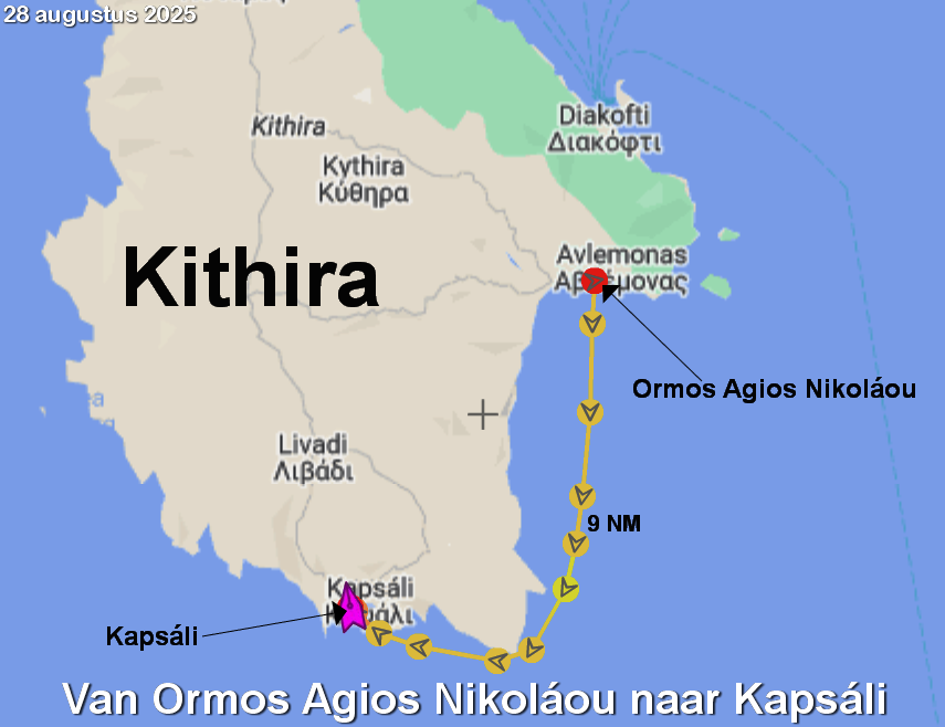 Het lijkt me niet aantrekkelijk om te vertrekken. Toch gaan we. De windrichting is gunstig om langs de westkant van Kithira naar het noorden te gaan. Dan varen we onder de (letterlijk) hoge wal. Dus geen golven. Eerst komt de wind bijna van achteren. Alleen de fok is uitgerold. Voordat we meer noord moeten sturen hijsen we het grootzeil met 1 rif. Die zit er nog in. Ook de fok wordt gereefd. En dan gaan we nog 8-9 knopen.
