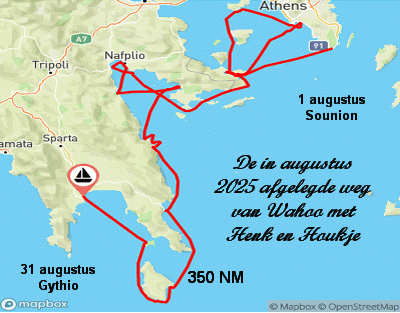 De wind komt niet recht van achteren. Door onze snelheid is de windhoek aan de wind 60 graden. Pas voor kaap Malea is het recht voor de wind. Dus gaat de fok over bakboord. Grootzeil blijft over stuurboord. Als de fok steeds invalt en met een klap weer wind vangt rollen we hem in en gaan alleen op het grootzeil verder.