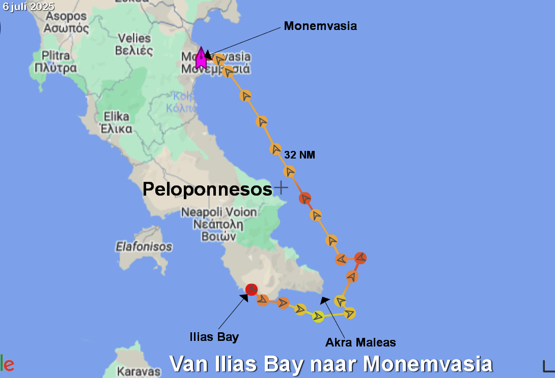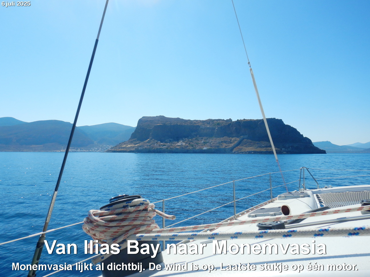 Na een hele rustige nacht, zonder wind en swell, worden we wakker in een prachtige omgeving. De zon schijnt alweer. Vandaag willen we naar Monemvasia. We wachten tot het een beetje begint te waaien. Dan vertrekken we. Hijsen het grootzeil en rollen de fok uit. Want verderop zijn schuimkopjes.