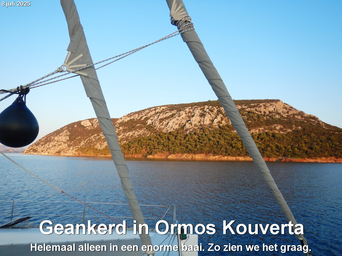 We ankeren midden in de grote baai Ormos Kouverta. Het ligt er prima. Geen ankertje op de apps Navily of Noforeignland. Geen idee waarom niet.