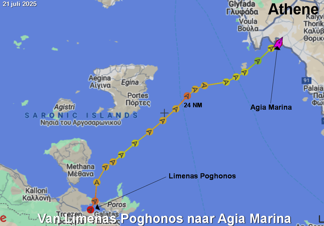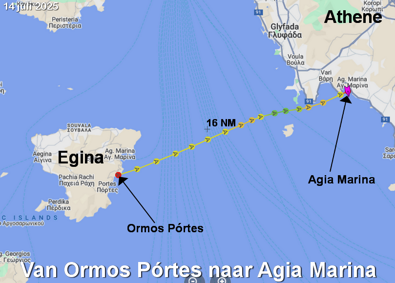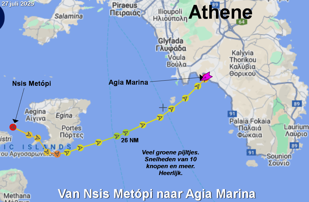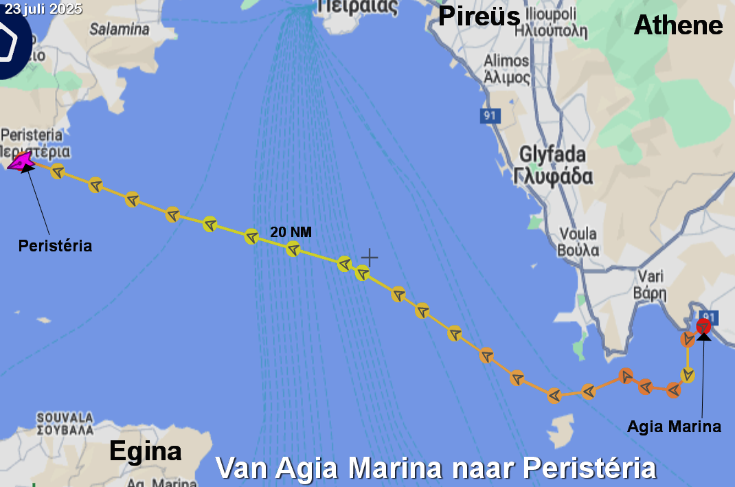 Alweer een mooie zeiltocht, met grootzeil en genua, naar Agia Marina. Daarbij zijn we het verkeersscheidingsstelsel voor de grote scheepvaart recht over gestoken, zoals het hoort.