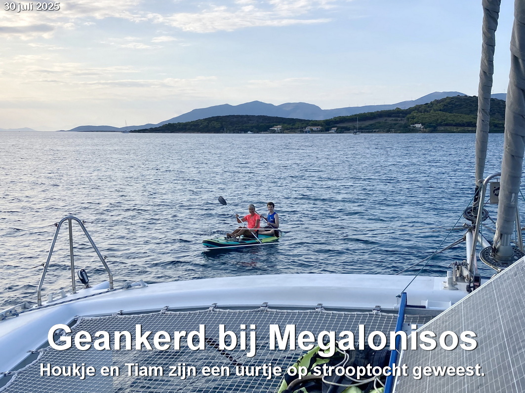 We ankeren zuid van een klein onbewoond eilandje en noord van Megalonisos.