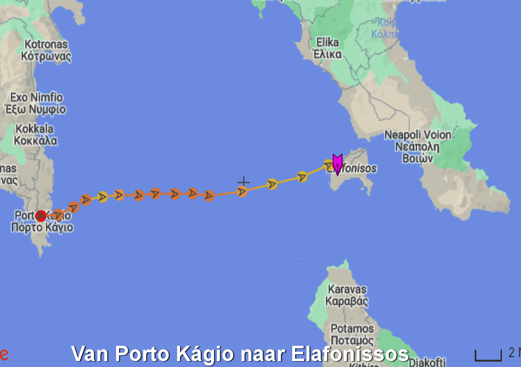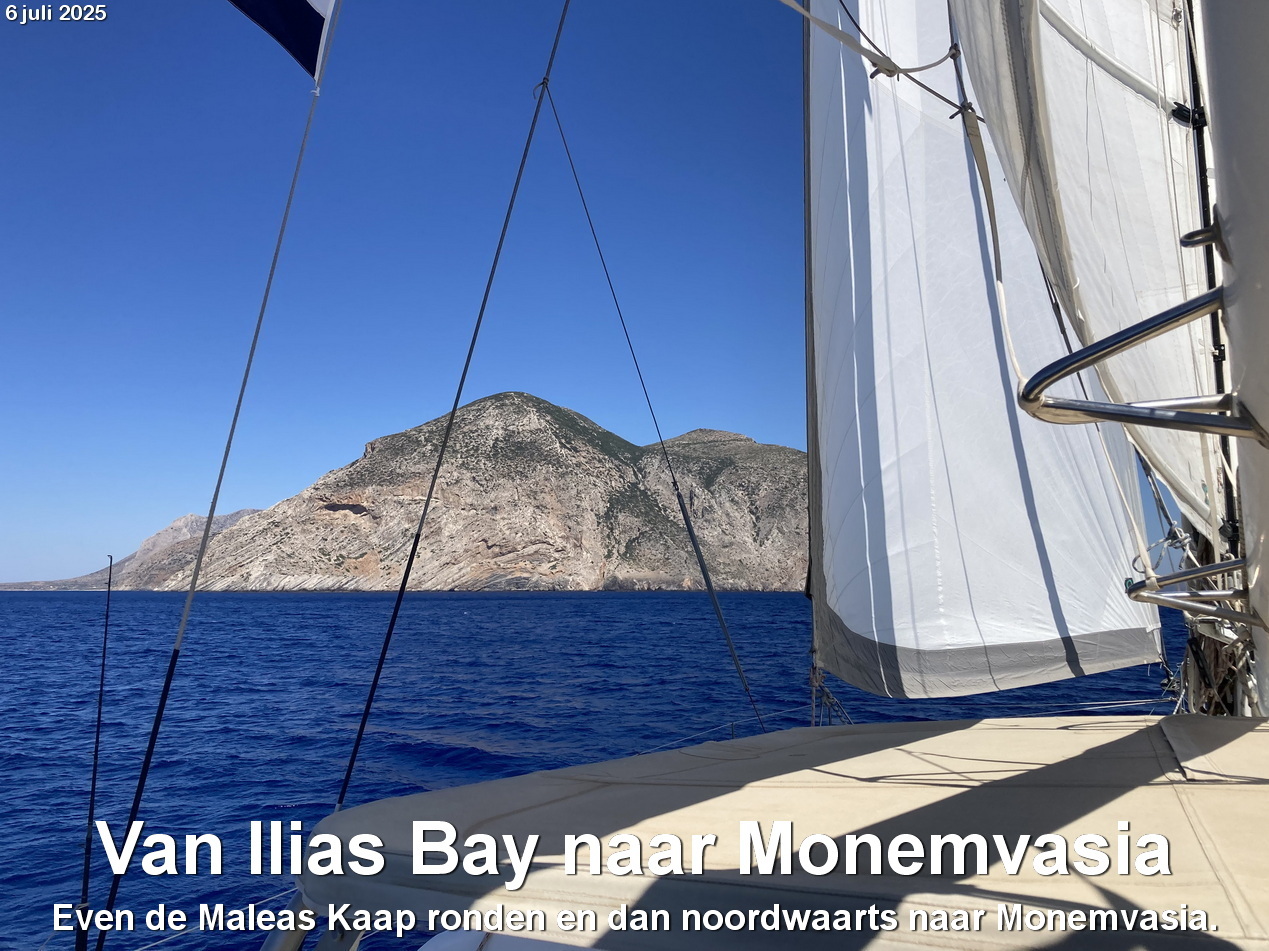 Het is kruisen naar de beruchte kaap Malea. De wind is weer erg veranderlijk en trekt even flink aan. Zodat er 10 knopen op het log staat. Even later is er veel minder wind en kan de genua uitgerold. We moeten inhouden om een vrachtschip voor langs te laten gaan. Dat doen we door erg scherp aan de wind te zeilen.