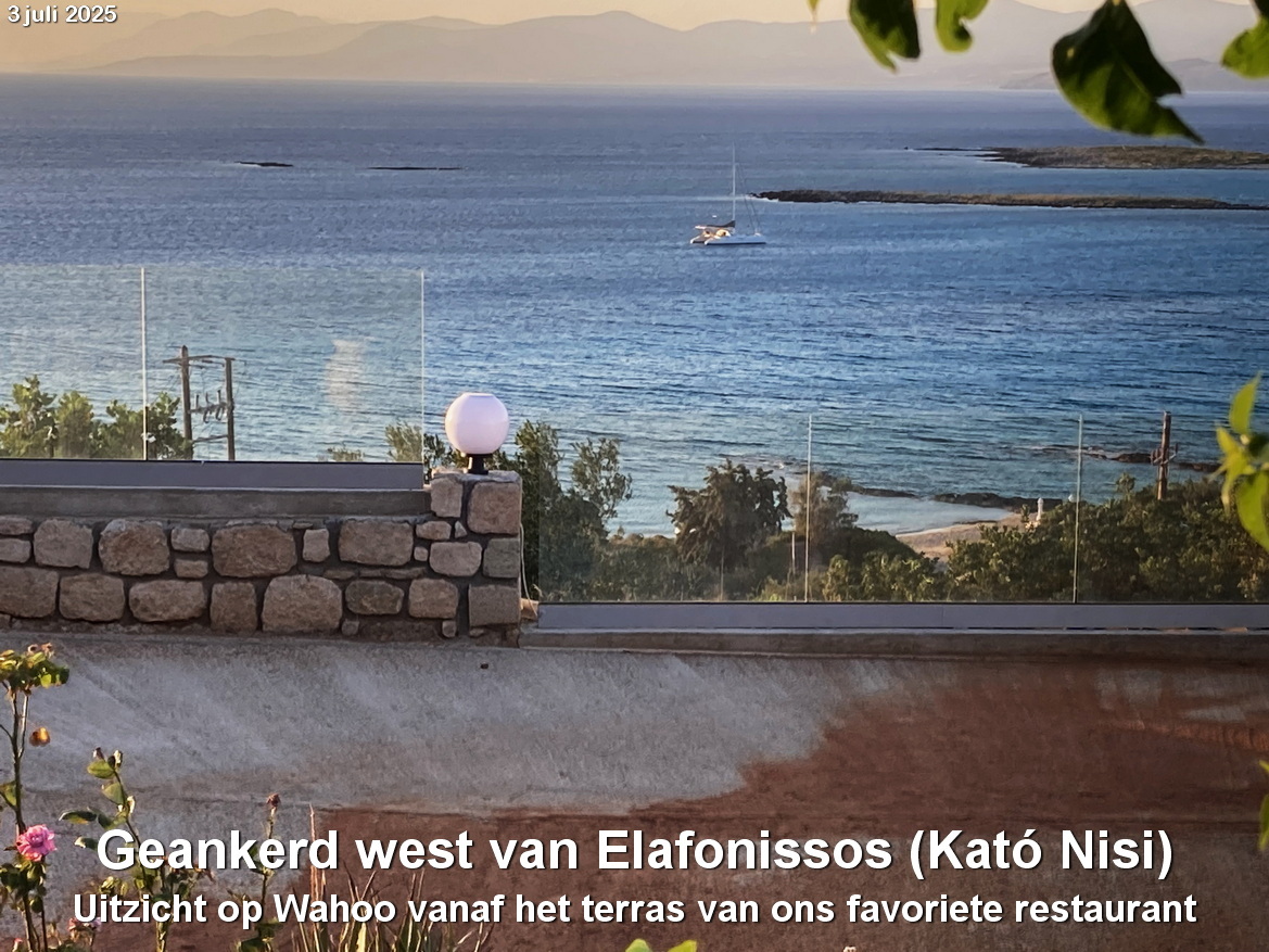 We rollen de genua uit en zetten de schoothoek vast met een extra lijntje, een barberhauler, op de midden-kikker aan bakboord. Zo zeilen we 15 mijlen in 4 uren. Dan is de wind teveel afgezwakt en motoren we de laatste 8 mijlen. Om ruim voor donker te ankeren in onze favoriete baai Kató Nisi aan de noordwestkant van Elafonisos. Meteen even zwemmen, want het is nog steeds heet. Het anker ligt goed ingegraven. Dat is belangrijk als het morgen hard gaat waaien.