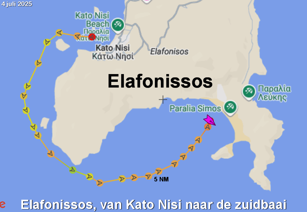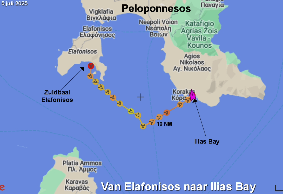 Wat een geschommel in de ochtend! De wind is westelijk van noord en er lopen flinke golven de baai in. We gaan niet zwemmen, maar ankerop. Naar de zuidbaai van Elafonisos. Met alleen de fok uitgerold gaat het hard. Nog wat harder als we de hoek omgaan en naar zuidoost draaien. 11 knopen op de teller. Het wordt aan de wind en we rollen de fok in. De laatste mijlen naar de noordoosthoek van de baai motoren we. Het anker valt in zand en houdt meteen.