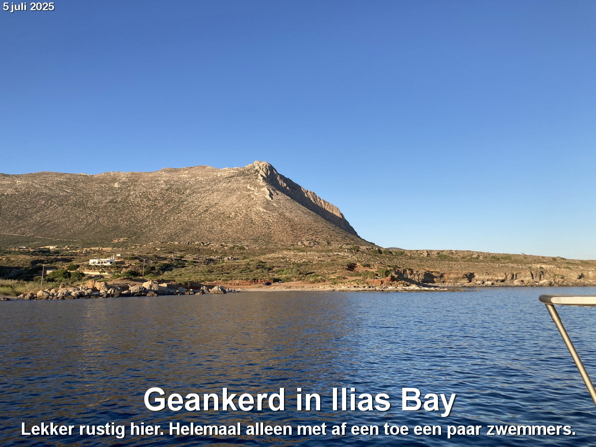 Eerst gaan we zeilen. Om half 4 vertrekken we voor 10 mijlen zeilen naar ‘wreckbay’. Daar komen we niet, want de wind is tegen en zó veranderlijk, dat ik een hele tijd met de hand stuur. We motoren uiteindelijk 5 mijlen tegen de wind in naar een baai dichterbij, Ilias bay. Het anker valt in zand, maar er zijn ook dikke stenen en zeegras. Een mooie baai. Een paar huizen en een paar strandjes met een paar mensen.