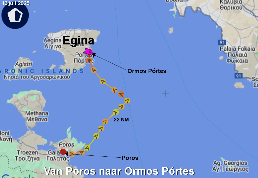 Ons doel is Poros. Het is aan de wind en kruisen. Het laatste uur motoren we.