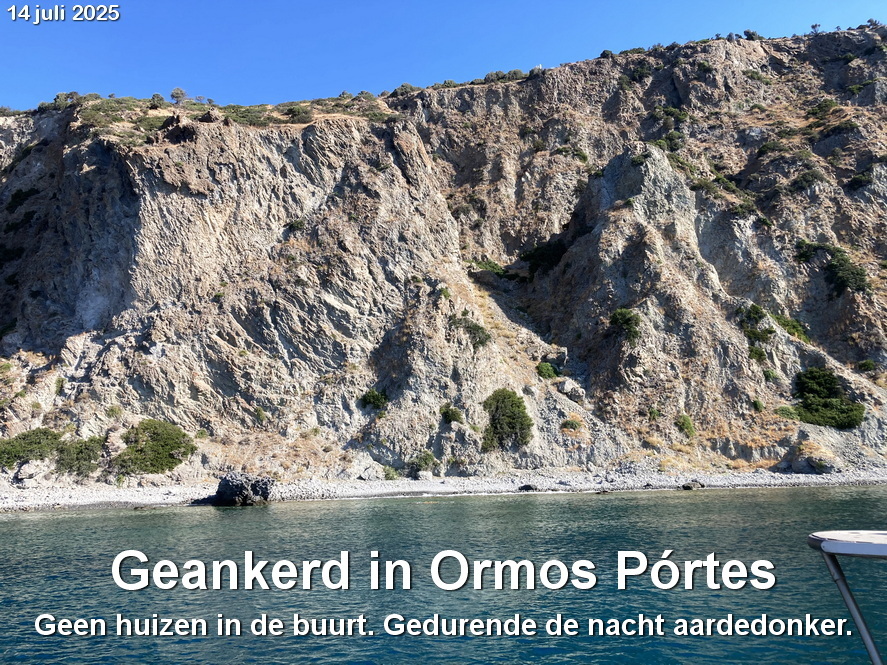 Daarna zijn we vertrokken en was het kruisen naar de oostkant van het eiland Aegina. We ankeren in een mooie baai, iets ten noorden van Pórtes, omdat de wind op is. We hebben de baai helemaal voor ons alleen. Prachtige plek met hoge steile rotswanden en helder blauw water. ’s Nachts is het er heel donker.