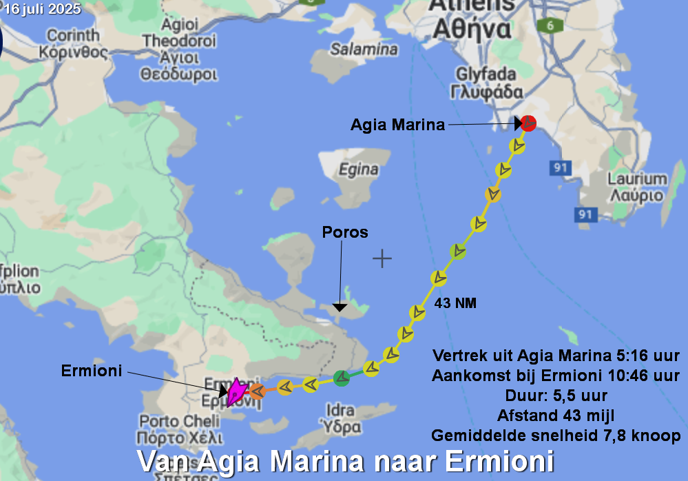 Van Agia Marina naar Ermioni, een snelle zeiltocht, 43 mijlen in 5,5 uur (16 juli)