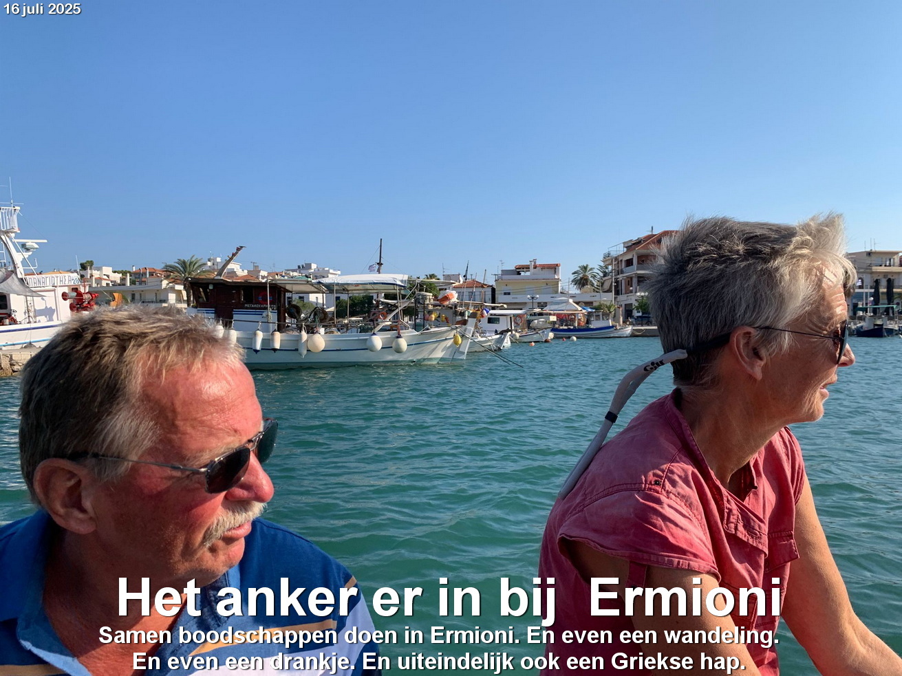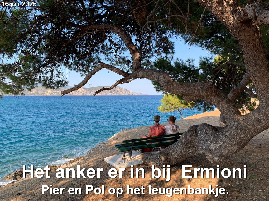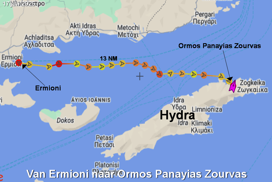 Eerst voor 8 uur even zwemmen. Dan vertrekken. Het grootzeil hijsen is lastig, het waait hard en de wind is erg veranderlijk. De koers is recht voor de wind tot het begin van het verkeersscheidingsstelsel. De fok doet niet veel en wordt een tijd ingerold. Als we het scheidingsstelsel achter ons laten hebben we een gunstiger koers en kan de fok er weer bij. Het gaat hard. Onze maximumsnelheid is 15 knopen. De gemiddelde snelheid 7,8 knopen. We ankeren na 5,5 uur in de baai bij Ermioni.