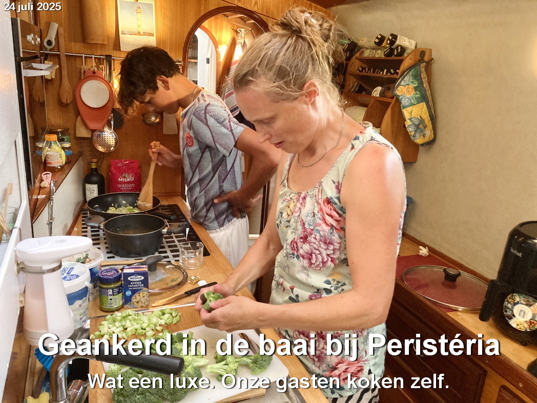 We gaan eerst boodschappen doen en daarna zeilen. Doel is het eiland Salamina. Eerst kruisen we. Dan is er geen wind en motoren we tot in het verkeersscheidingsstelsel. Daar waait het lekker en kunnen we weer zeilen. De laatste mijlen tot de baai bij Peristéria motoren we. Het is een prachtige baai, afgeschermd aan de zuidkant door 2 eilandjes.