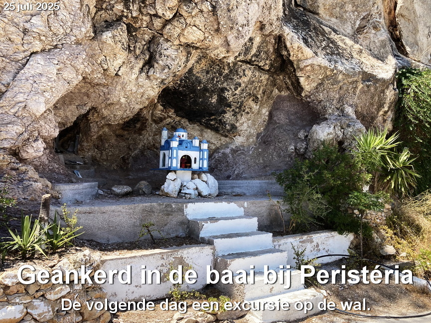 We zwemmen terug naar de volgboot. Klimmen op sup of kayacat en peddelen naar de noordwestkant van de baai. Daar is een klein kapelletje dat we willen bekijken. Zelfde procedure. Alleen stappen Judah en Sifra op de kade. Nicolet en ik zwemmen naar het strandje. Het kapelletje is mooi en staat in een nis in de rotswand.
