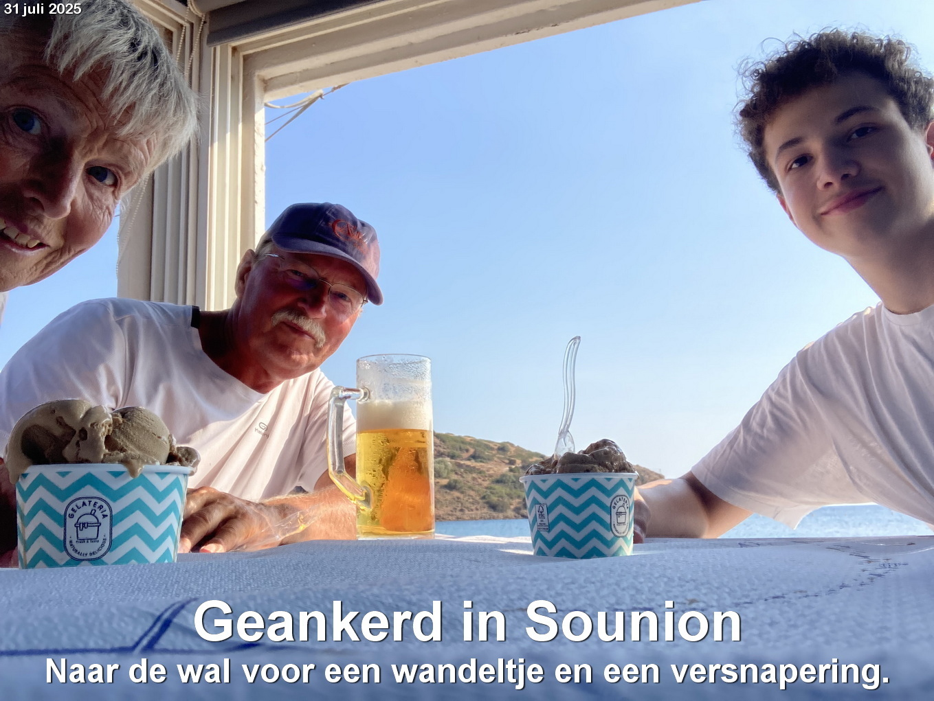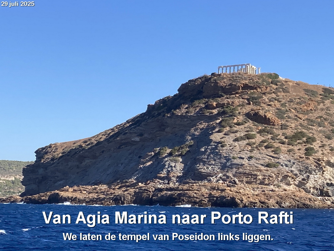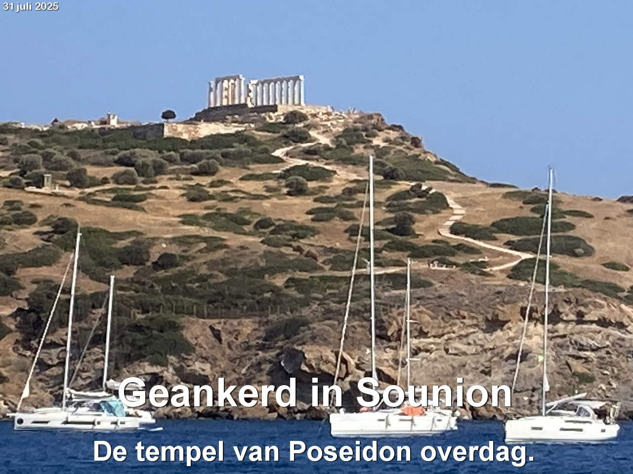We ankeren in de baai van Sounion. Een ruime baai bij de tempel van Poseidon. Dat is een blikvanger, zowel overdag als ‘s avonds. Dan is hij verlicht.