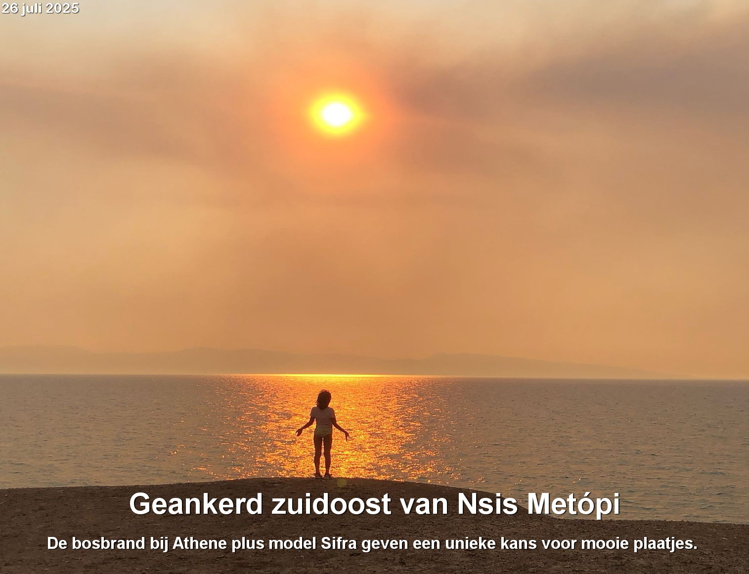 In de avond gaan Nicolette en Sifra op de sup naar het eiland. Ze bezoeken het kerkje. Sifra luidt de klok. Er is een bosbrand in de buurt van Athene. Daarom is de lucht oranjebruin en de zon verspreidt een oranje gloed over het water. Het zorgt voor een mooi plaatje met Sifra als ‘model’.