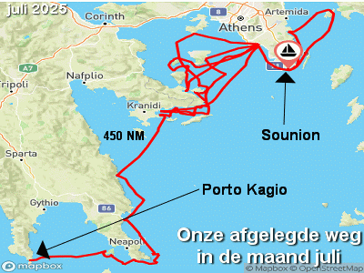 Halverwege de maand juli willen we in Agia Marina zijn om onze eerste gasten te ontvangen. We hoeven ons niet te haasten om daar te komen. De 2e helft van de maand zeilen we met onze opeenvolgende gasten in de Saronische Golf, ook wel Golf van Egina genoemd. Het is de hele maand mooi weer. Meestal is er voldoende wind om te kunnen zeilen. Vaak is dat pas in de middag. Als het te heet is koelen we af in het water. ’s Nachts hebben we de ventilator boven het bed aan. De hoge temperaturen ervaren we niet als een probleem.