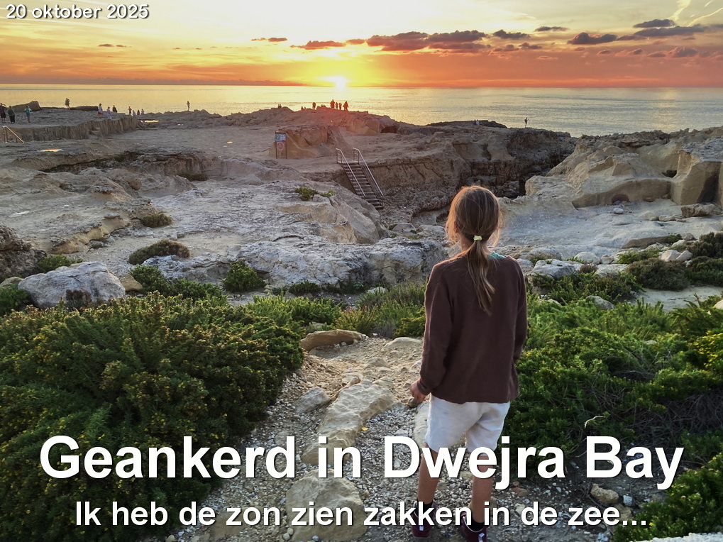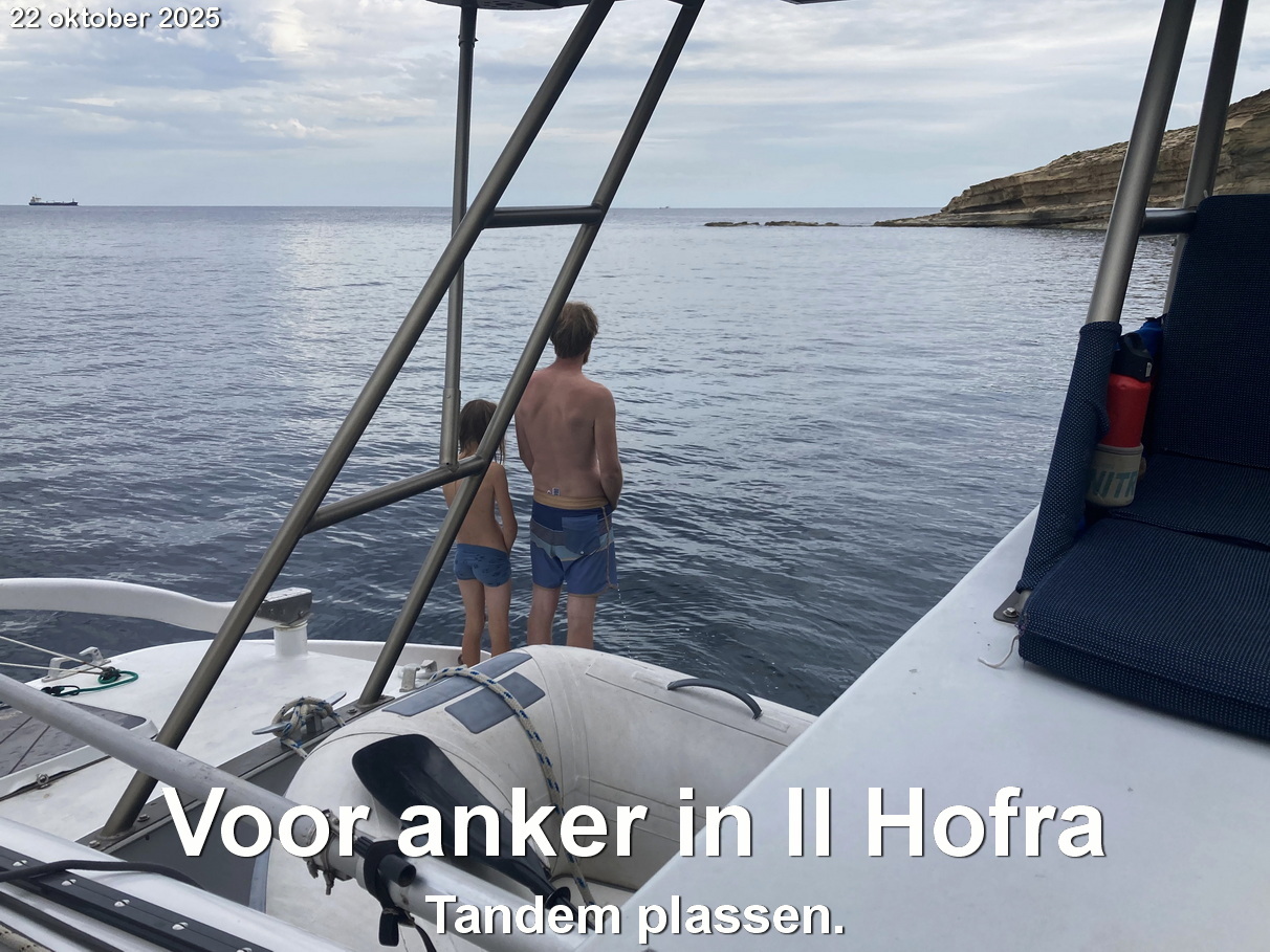 Na 6,5 uur en 58 mijlen ankeren we in onze favoriete baai aan de oostkant van Malta, Il Hofra i Kbira. Daar is het opeens warm. De hele overtocht zaten we flink in de kleren. De wind maakte het koud.