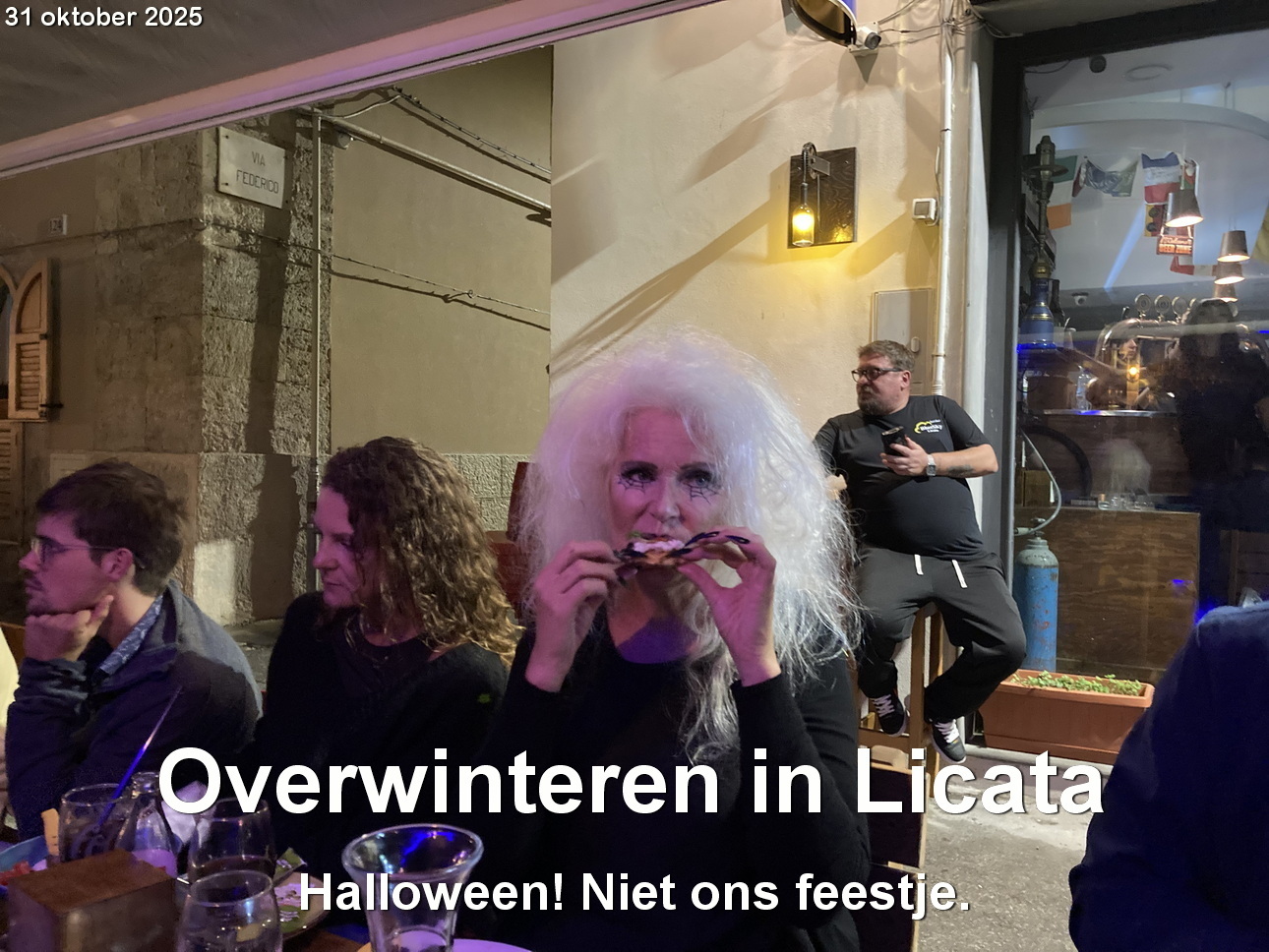 We gaan naar happy hour bij de Blue Sky bar. Daar wordt Halloween gevierd. Sommigen zijn verkleed en geschminkt.
