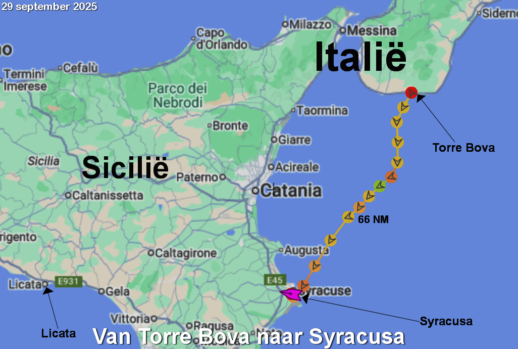 Dichter bij Licata neemt de wind wat af. Uiteindelijk doen we bijna 7 uren over 69 mijlen. Dat is gemiddeld 10 knopen. Het komt overeen met ons record van 4 juni 2025, ook naar Licata.