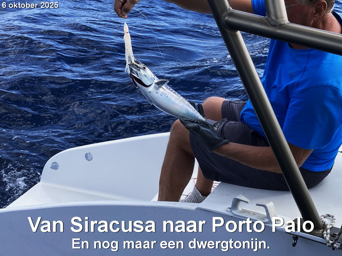 We hebben alweer een mooie zeildag. Met soms zon. Henk vangt 2 dwergtonijnen. Eentje is te klein en mag weer zwemmen. De andere is 1135 gram.