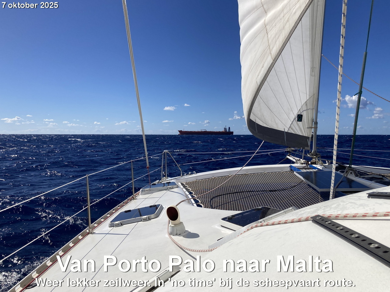 Er is voldoende wind, dus we kunnen meteen zeilen. Met de genua uitgerold.