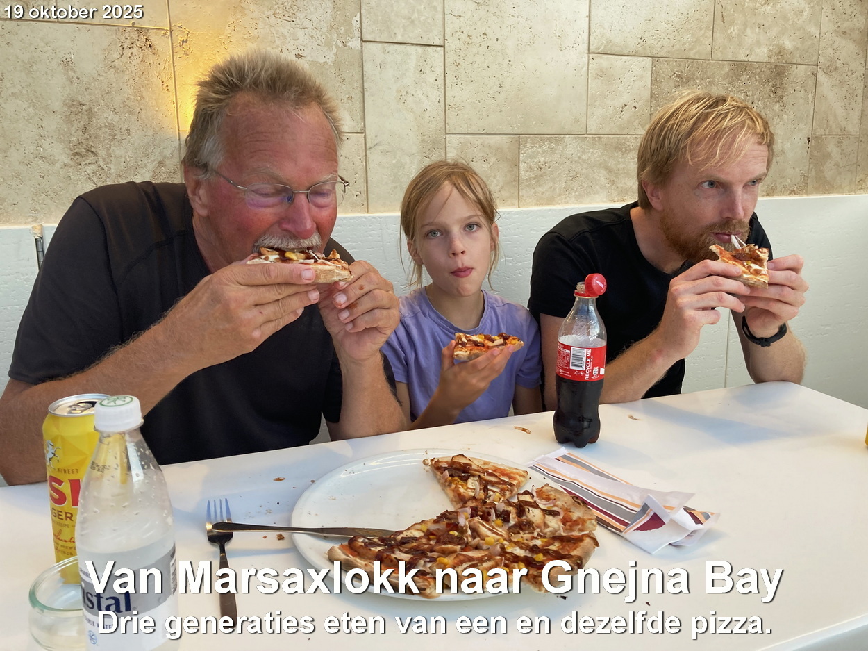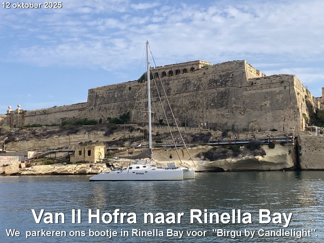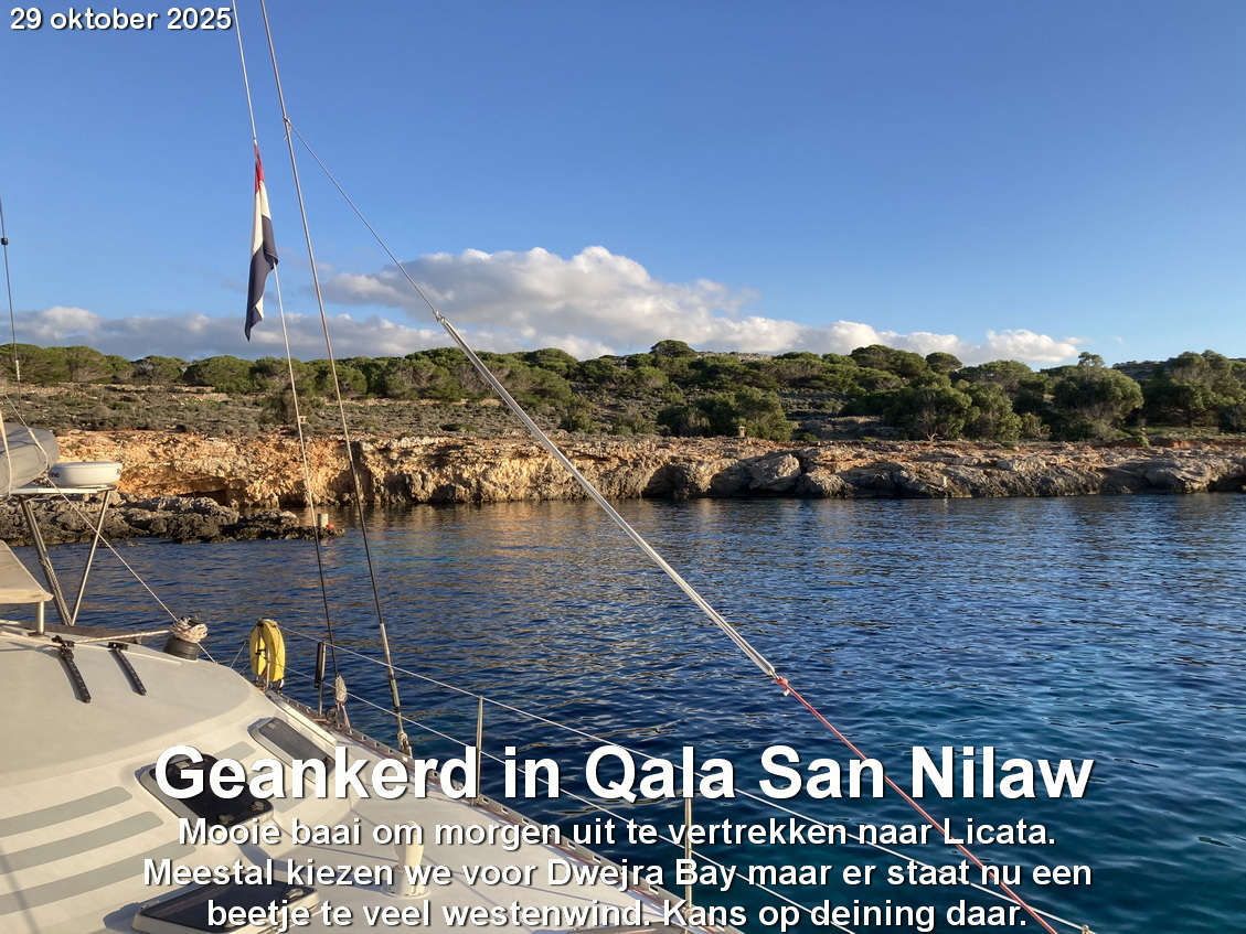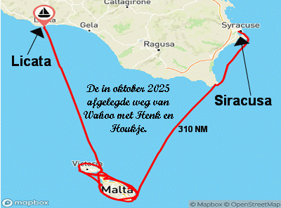 In oktober is het nog vaak mooi weer. We krijgen bezoek van zoon Sander en kleinzoon Hedzer. Zij komen 18 oktober naar Malta en wij willen daar ruim op tijd zijn. Dus zodra de wind en het weer gunstig zijn verlaten we de baai van Syracusa en gaan richting Malta. Eind oktober zeilen we, ook weer bij gunstige omstandigheden, van Malta naar Licata, onze winterhaven aan de zuidkant van Sicilië.