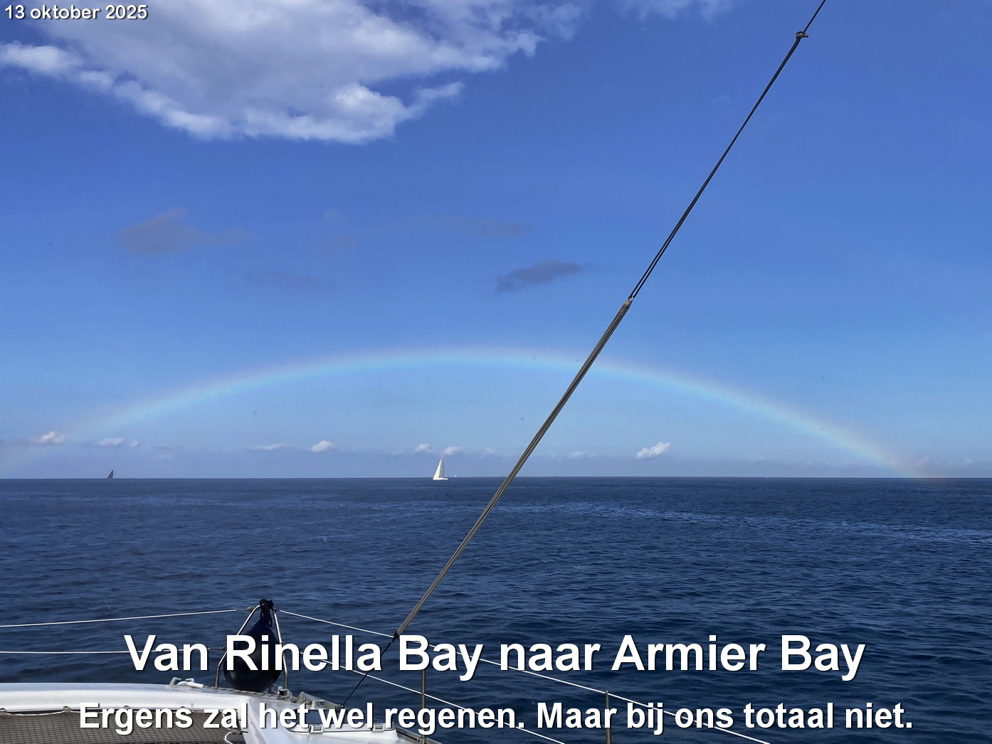 Aan het eind van de middag willen we naar de wal. Maar volgens buienradar gaat het regenen. En dat doet het ook. Een hoosbui. We blijven aan boord. Even later een hele mooie regenboog. Als de zon gaat schijnen.