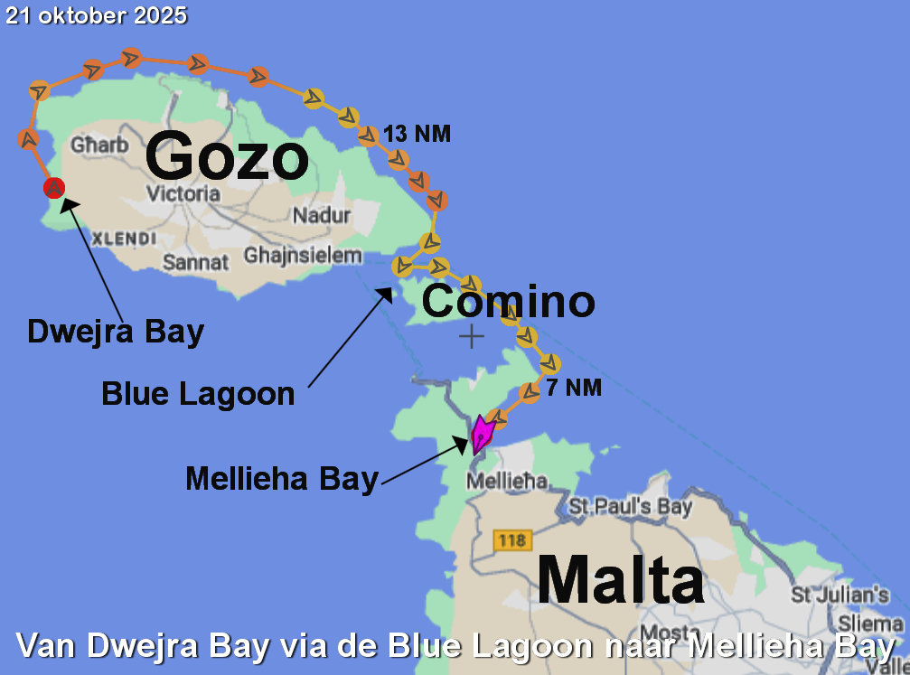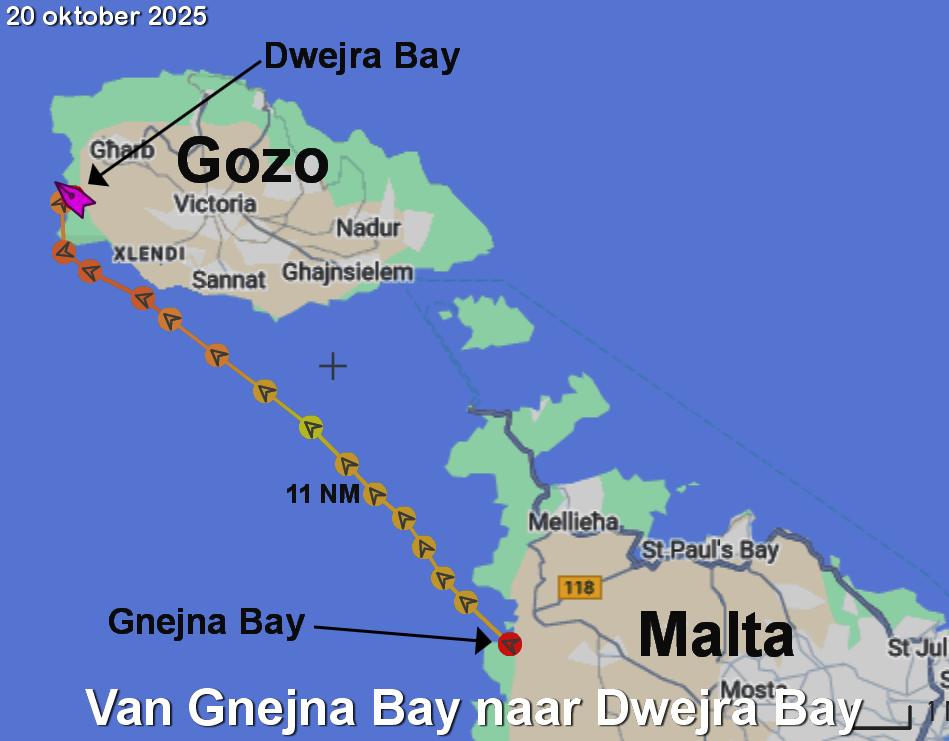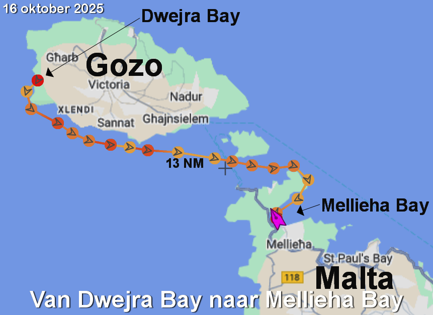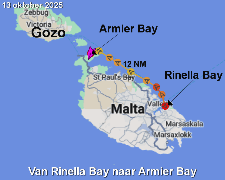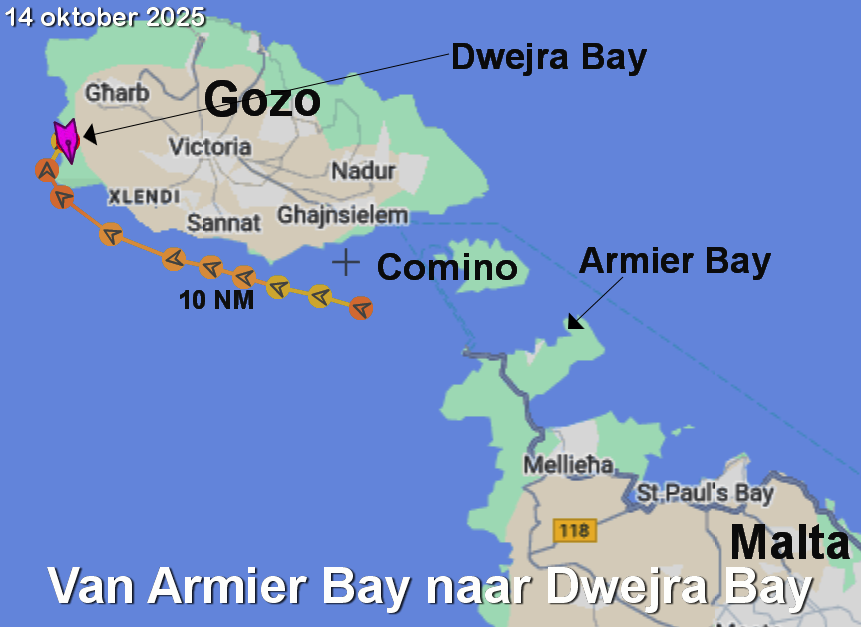 Om half 1 is het afgelopen. We overleggen en gaan ankerop. Dwejra bay is ons doel en het is bezeild met grootzeil en fok.