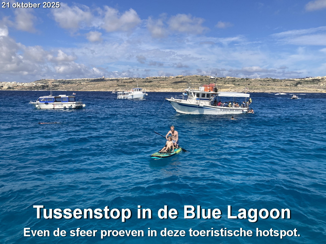In de Blue Lagoon, een blauwe baai aan de westkant van het eiland Comino, is het druk met toeristenboten. Schepen vol met mensen worden aangevoerd. En gaan weer weg om een nieuwe lading op te halen.